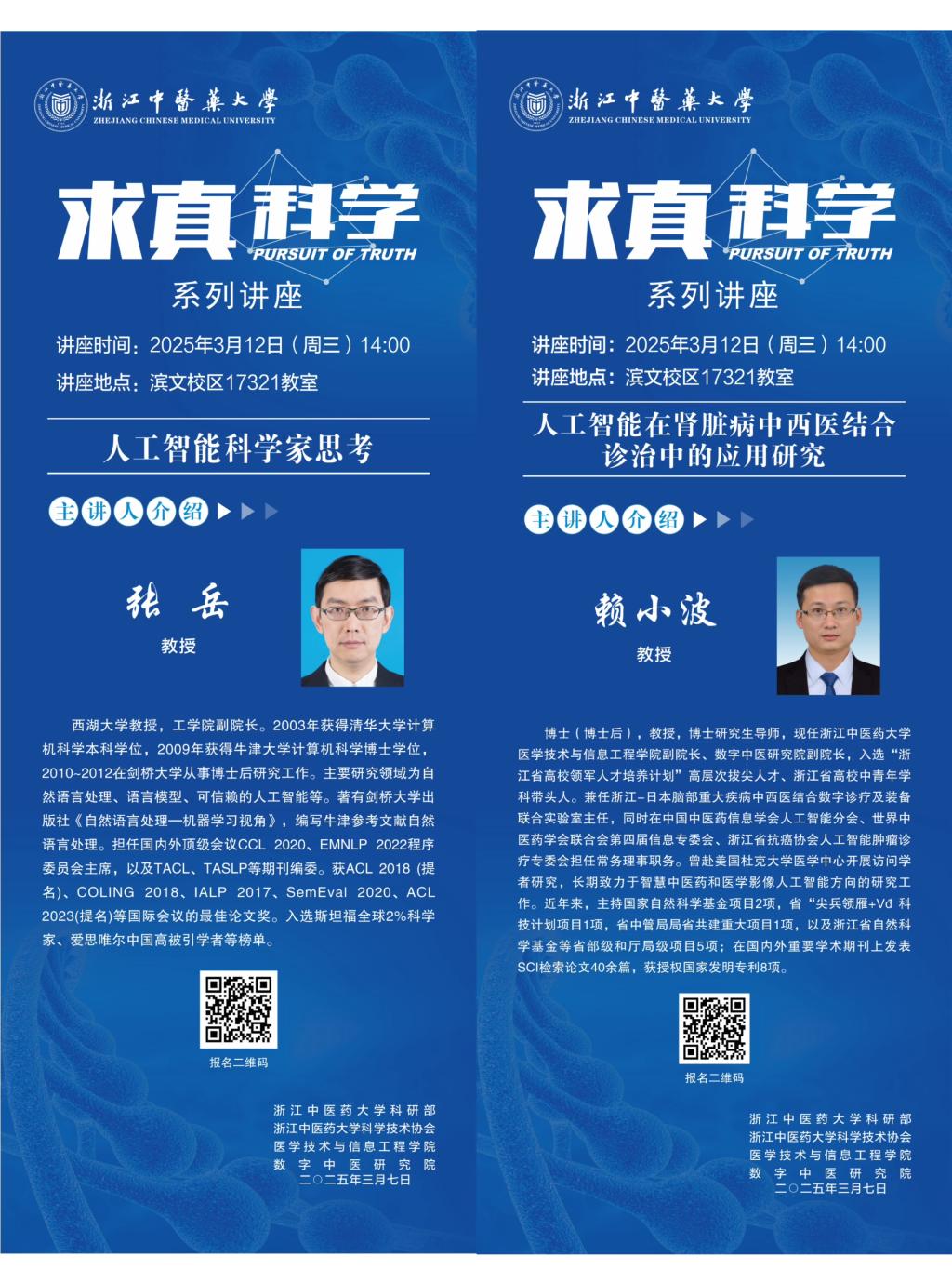 为提升科研创新能力和科学素养,拓展学术领域,营造我校科研学术氛围,学校邀请西湖大学工学院副院长张岳教授现场讲座,主题为:人工智能科学家思考;医学技术与信息工程学院副院长、数字中医研究院副院长赖小波教授,主题为:人工智能在肾脏病中西医结合诊治中的应用研究。现将有关事项通知如下: