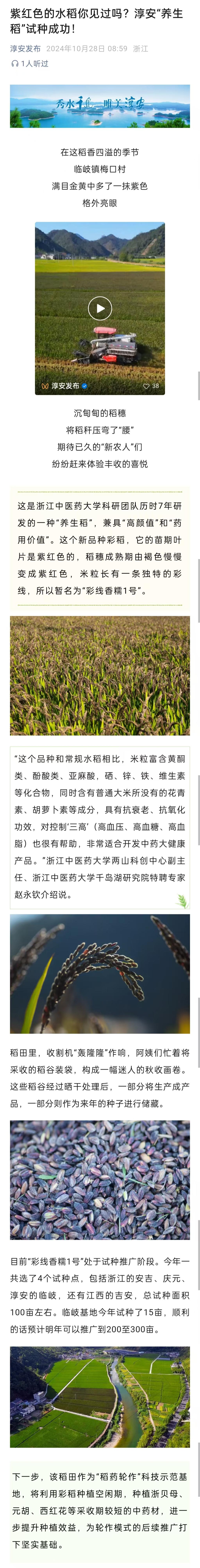 学习强国、淳安发布:紫红色的水稻你见过吗?淳安“养生稻”试种成功!